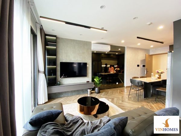 Căn hộ 2 phòng ngủ cộng Vinhomes Grand Park được thiết kế với nội thất tối giản và tông màu ghi và màu đen
